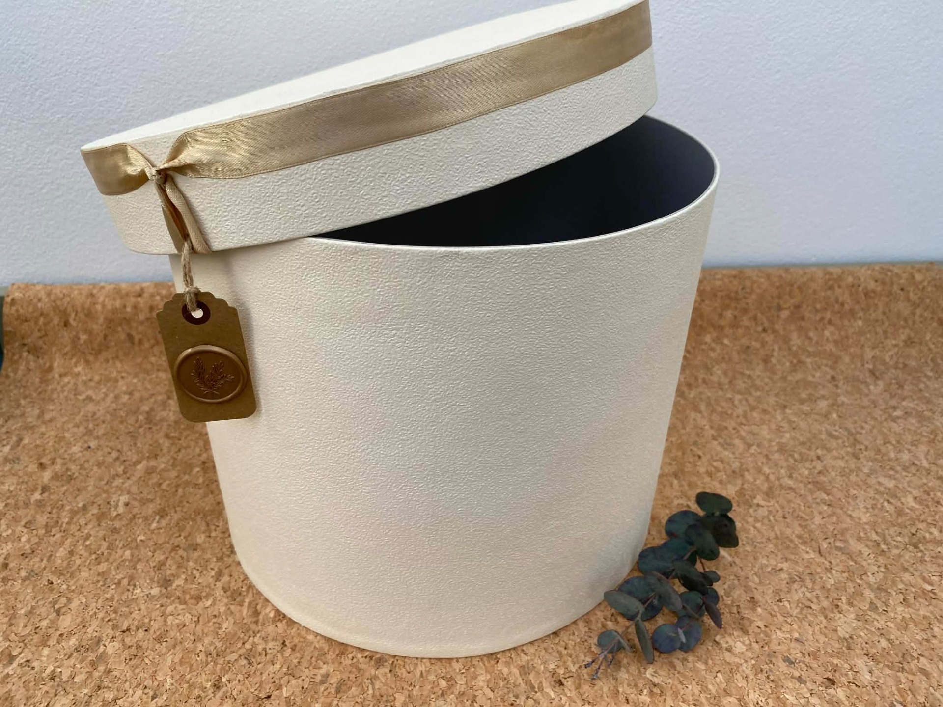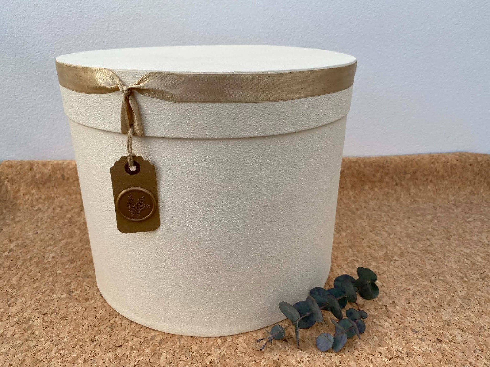 Ručně vyrobený svatební box na přání a obálky od hostů. Elegantní kulatá krabice ve smetanové barvě se saténovou stuhou je krásným doplňkem svatebního stolu a zároveň památkou na váš velký den.