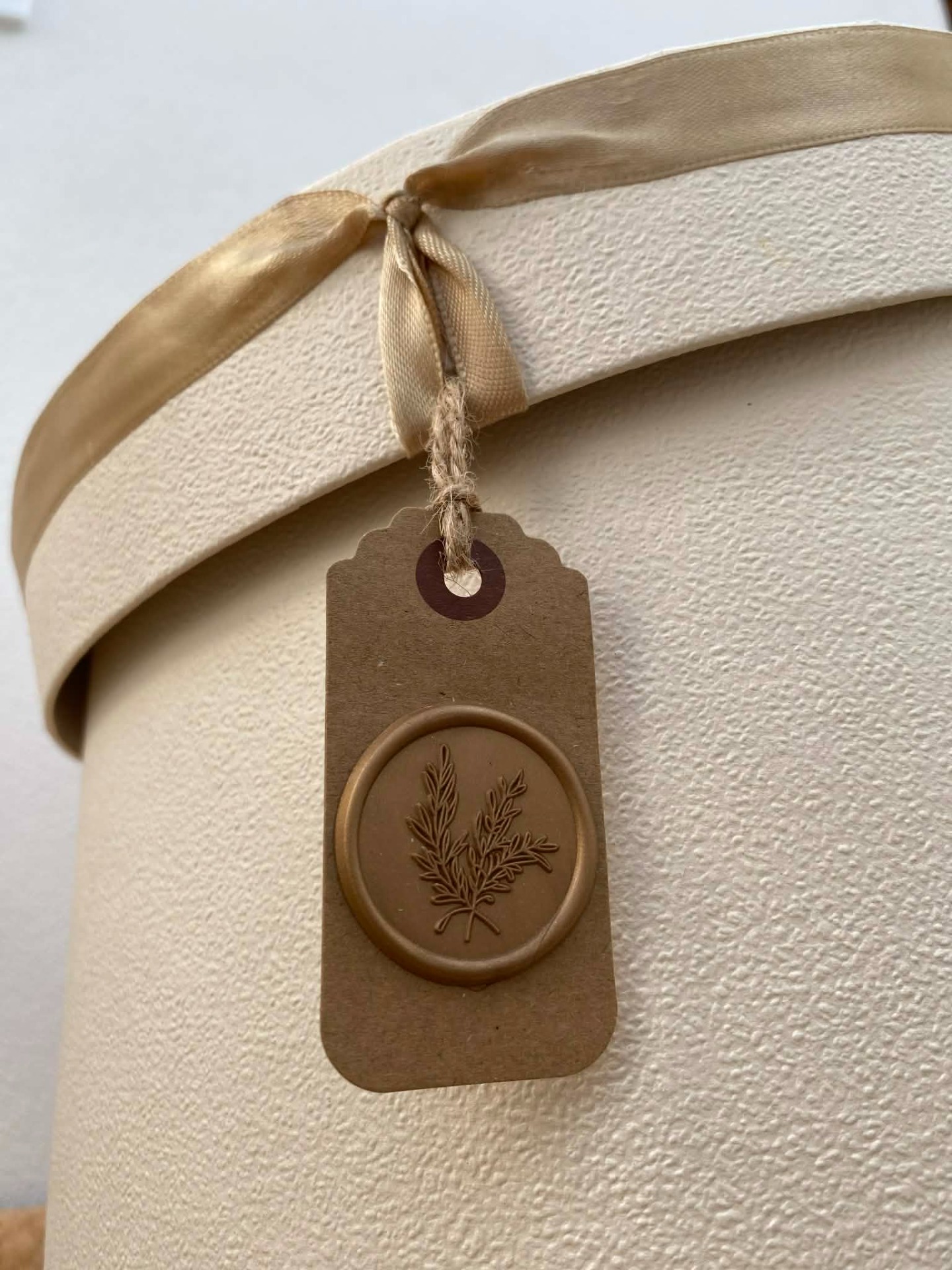 Krabice je ručně vyrobena z pevné lepenky a potažena kvalitním papírem ve smetanové barvě. Zdobí ji saténová stuha a visačka s voskovou pečetí.
